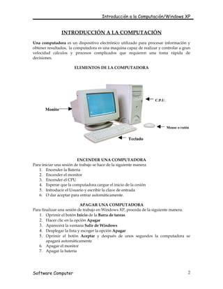 Este documento proporciona una introducción a Windows XP, incluyendo cómo encender y apagar una computadora, los componentes básicos de hardware y software, y las funciones y características principales de Windows XP como ventanas, menús contextuales, el escritorio de trabajo y el panel de control. Explica cómo personalizar la apariencia de Windows XP a través de temas, fondos de pantalla y configuraciones de ventana.