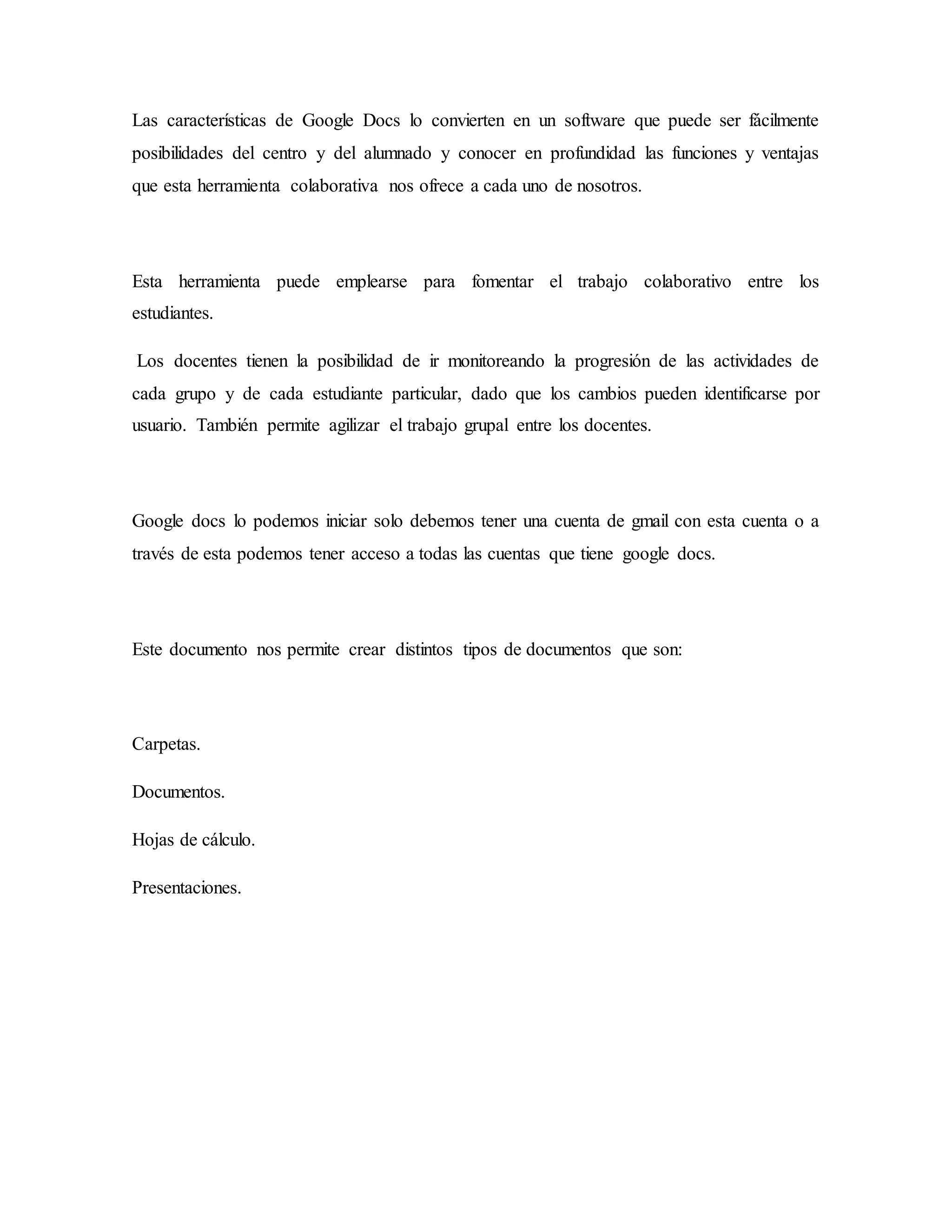 Google Docs permite a los usuarios crear, editar y compartir documentos, hojas de cálculo y presentaciones de forma gratuita y en línea desde cualquier dispositivo con acceso a Internet. Los documentos se pueden editar de manera colaborativa por varios autores al mismo tiempo y se guardan automáticamente para que todos tengan acceso a la versión más reciente. Además de ser gratuito, Google Docs ofrece funcionalidades similares a programas de ofimática convencionales y permite importar y exportar archivos a diferentes formatos.