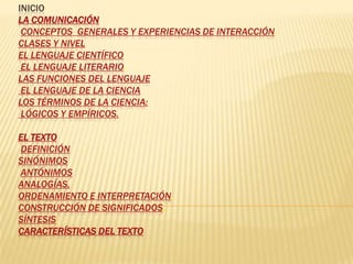 Este documento trata sobre varios temas relacionados con la comunicación y el lenguaje. Describe diferentes tipos de comunicación como la vertical u horizontal. Explica el lenguaje científico y literario, y sus diferencias. También cubre las funciones del lenguaje y el lenguaje específico de la ciencia. Finalmente, analiza conceptos como la objetividad y validación en el lenguaje científico.