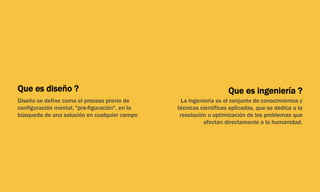 El documento introduce los conceptos de ingeniería y diseño. Define la ingeniería como la aplicación de conocimientos científicos para resolver problemas que afectan a la humanidad. Define el diseño como un proceso mental previo para configurar soluciones en cualquier campo. Luego discute que el diseño industrial crea conceptos y especificaciones que optimizan la función, valor y apariencia de productos para beneficio de los usuarios y fabricantes.