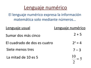 El documento describe el lenguaje algebraico. Explica que el lenguaje algebraico utiliza números y letras para expresar información matemática cuando los valores exactos son desconocidos. Proporciona ejemplos de cómo expresar operaciones matemáticas comunes en lenguaje algebraico en lugar de lenguaje usual.