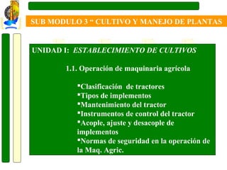 Este documento presenta información sobre la operación de maquinaria agrícola. Explica las partes principales de un tractor agrícola y sus funciones. También describe los procedimientos para enganchar implementos al tractor de forma segura usando el sistema de enganche de tres puntos. El objetivo es que los estudiantes conozcan la importancia de la maquinaria agrícola y sus fundamentos básicos de uso y operación.