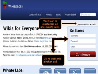 Este documento proporciona instrucciones sobre cómo usar una cuenta wiki. Explica cómo iniciar sesión, acceder al panel de control, editar páginas, insertar imágenes, videos y tablas, realizar modificaciones administrativas, invitar usuarios y proteger información. También incluye enlaces para obtener más detalles sobre el uso de wikis.