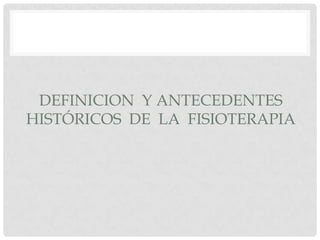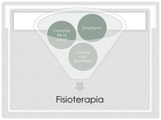 La fisioterapia tiene sus orígenes en el uso de agentes físicos para el tratamiento de enfermedades desde la antigüedad. A lo largo de los siglos, se fue profesionalizando y desarrollando un cuerpo de conocimiento científico sobre el uso terapéutico del ejercicio, masaje, agua, electricidad y otros métodos. En el siglo XX, la fisioterapia emerge como una profesión de la salud centrada en la restauración del movimiento aplicando principios científicos.