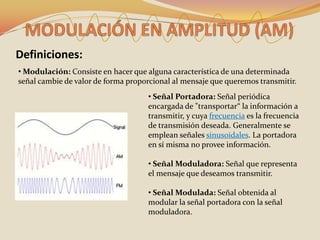 Este documento explica los conceptos básicos de la modulación de amplitud, incluyendo las definiciones de señal portadora, señal moduladora y señal modulada. También describe por qué se usa la modulación, el proceso de modulación en amplitud, y cómo se puede demodular la señal usando un detector de envolvente. Finalmente, presenta algunas conclusiones clave sobre la modulación en amplitud.