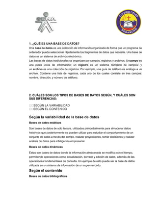 Este documento introduce los conceptos básicos de las bases de datos, incluyendo las definiciones de base de datos, campos, registros y archivos. Explica los tipos de bases de datos según su variabilidad y contenido. Describe las características de los datos relacionados e integrados y enumera algunas ventajas y desventajas del uso de bases de datos.