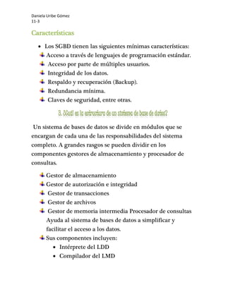 Este documento describe las características y funciones de un sistema de gestión de bases de datos. Explica que un SGBD permite almacenar, modificar y extraer información de una base de datos mediante herramientas para agregar, eliminar, modificar y analizar datos. También clasifica los tipos de bases de datos según su contenido, variabilidad de datos y modelo de administración.
