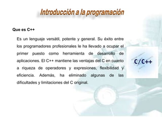 Este documento proporciona una introducción al lenguaje de programación C++. Explica que C++ es un lenguaje versátil y potente que mantiene las ventajas de eficiencia de C. También describe las librerías de cabecera comunes, la función principal "main", declaraciones de variables, y sentencias básicas como mostrar y leer datos. Además, incluye ejemplos de programas simples y tipos comunes de errores.
