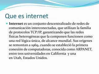 Internet es una red descentralizada de redes interconectadas que usan protocolos TCP/IP para funcionar como una red lógica global. Sus orígenes se remontan a 1969 con la conexión de tres universidades en California y una en Utah. La World Wide Web, desarrollada en 1990, permite la consulta remota de archivos de hipertexto usando Internet. Internet tiene un impacto profundo en el trabajo, el ocio y el conocimiento al dar acceso fácil a información en línea, aunque el número de usuarios aún es relativamente bajo.