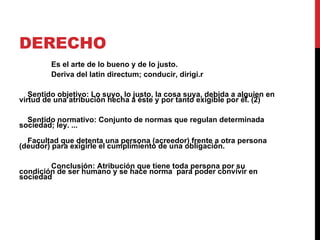 Este documento define conceptos clave como derecho, poder y Estado, y describe la teoría tripartita del poder de Montesquieu. Define el Estado social de derecho como una forma de organización donde los derechos de los individuos son protegidos a través de instituciones estatales. Describe la división de poderes ejecutivo, legislativo y judicial, así como las diferentes ramas y funciones de cada uno.