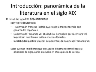 Este documento resume la literatura del siglo XIX en España. La primera mitad del siglo fue dominada por el Romanticismo, que se caracterizó por la expresión de sentimientos, la evasión a través de la imaginación y la defensa de la libertad individual. La segunda mitad trajo el Realismo y el Naturalismo, que se enfocaron en la observación objetiva de la realidad contemporánea y el análisis psicológico de personajes de la burguesía y el proletariado.