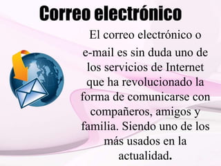 El documento describe el correo electrónico y sus características principales. Explica que el correo electrónico ha revolucionado la comunicación al acortar distancias y tiempos de envío. También describe las ventajas como la rapidez y facilidad de envío de archivos adjuntos, y las desventajas como la posibilidad de recibir virus o spam. Explica los tipos de cuentas de correo electrónico y los pasos para crear una cuenta.