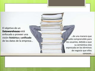 Este documento proporciona una introducción a las bases de datos. Brevemente describe las bases de datos como conjuntos de datos relacionados almacenados de forma permanente en un ordenador con el propósito de ser consultados. Luego resume las capas principales de un software, incluyendo la interfaz de usuario, lógica de negocio y base de datos. Finalmente, menciona algunas tecnologías clave relacionadas con bases de datos como modelos entidad-relación, data warehousing, OLAP y minería de datos.