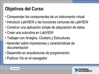 Este documento presenta un resumen de los objetivos y contenidos de un curso sobre instrumentación virtual con LabVIEW. El curso cubre la creación de aplicaciones de adquisición de datos, el uso de subrutinas, arreglos y estructuras de datos, así como la publicación de instrumentos virtuales en el navegador.