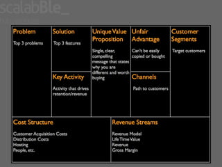 El documento presenta el concepto de Lean Startup, una metodología que ayuda a las startups a encontrar un modelo de negocio viable mediante iteraciones rápidas y validación del aprendizaje del cliente. Se hace énfasis en la importancia del desarrollo del cliente y el uso de un producto mínimo viable (MVP) para evitar construir productos no deseados. Además, se discuten mitos comunes sobre Lean Startup y casos de pivoteo exitoso de empresas conocidas.