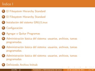 El documento habla sobre la instalación y administración de Linux. Explica los pasos para instalar el sistema operativo, incluyendo la configuración inicial, particionamiento del disco, instalación de paquetes y configuración de archivos. También cubre temas como agregar y quitar programas, administrar usuarios y tareas programadas.