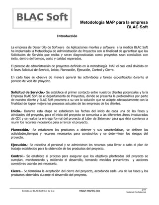El documento presenta la metodología de administración de proyectos (MAP) de BLAC Soft, la cual consta de 6 fases (solicitud de servicio, inicio, planeación, ejecución, control y cierre) y describe brevemente cada una. También incluye una tabla de contenido con 41 tareas y su estado de progreso.