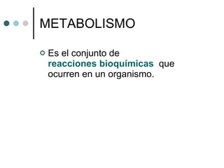 El documento describe los conceptos fundamentales del metabolismo. Explica que el metabolismo incluye las reacciones bioquímicas que ocurren en los organismos y tiene como objetivos obtener energía, convertir nutrientes en moléculas celulares y sintetizar y degradar biomoléculas. Se divide en vías catabólicas, que producen energía, y vías anabólicas, que requieren energía. Las células se comunican a través de señales químicas como hormonas, neurotransmisores y citoquinas que activan seg