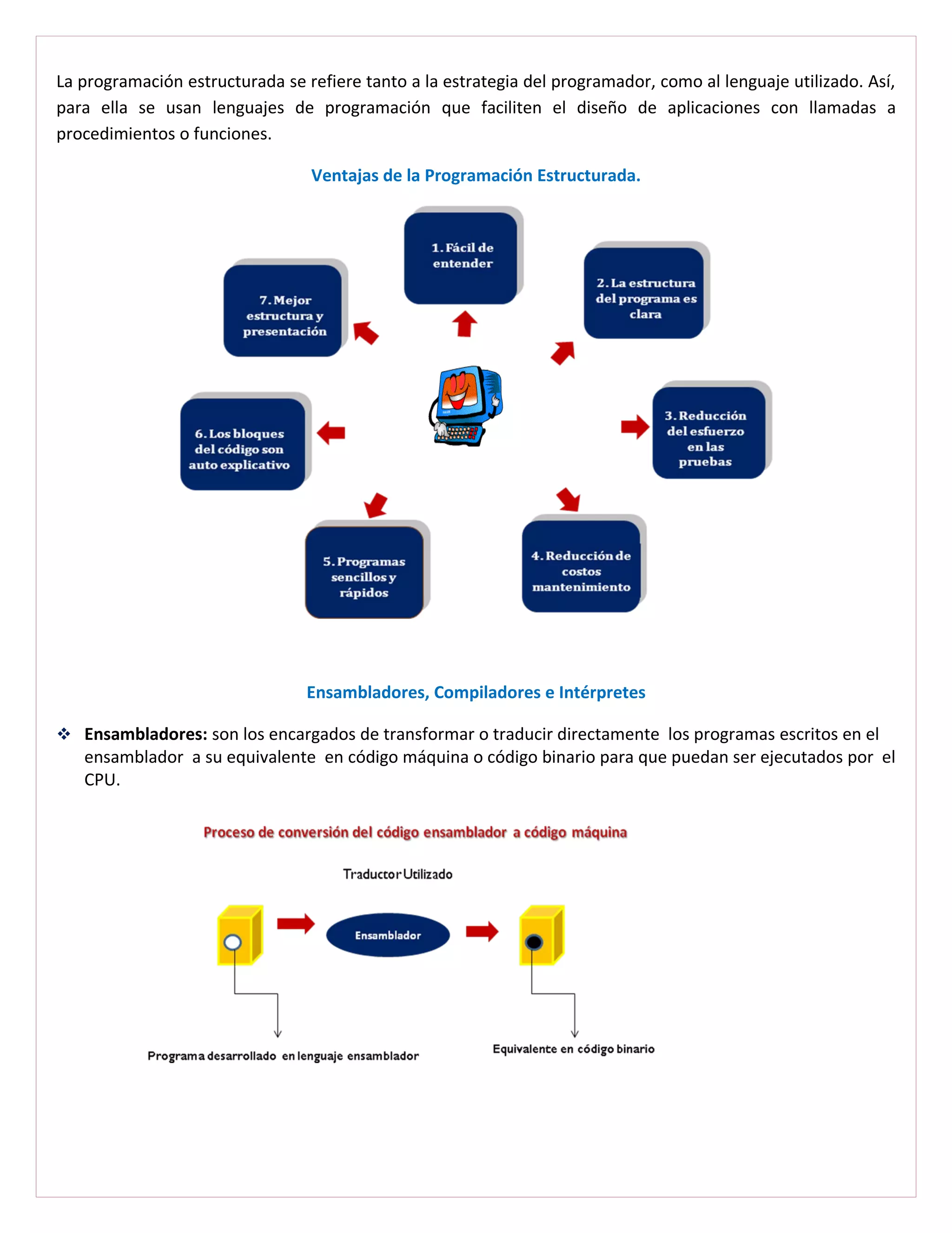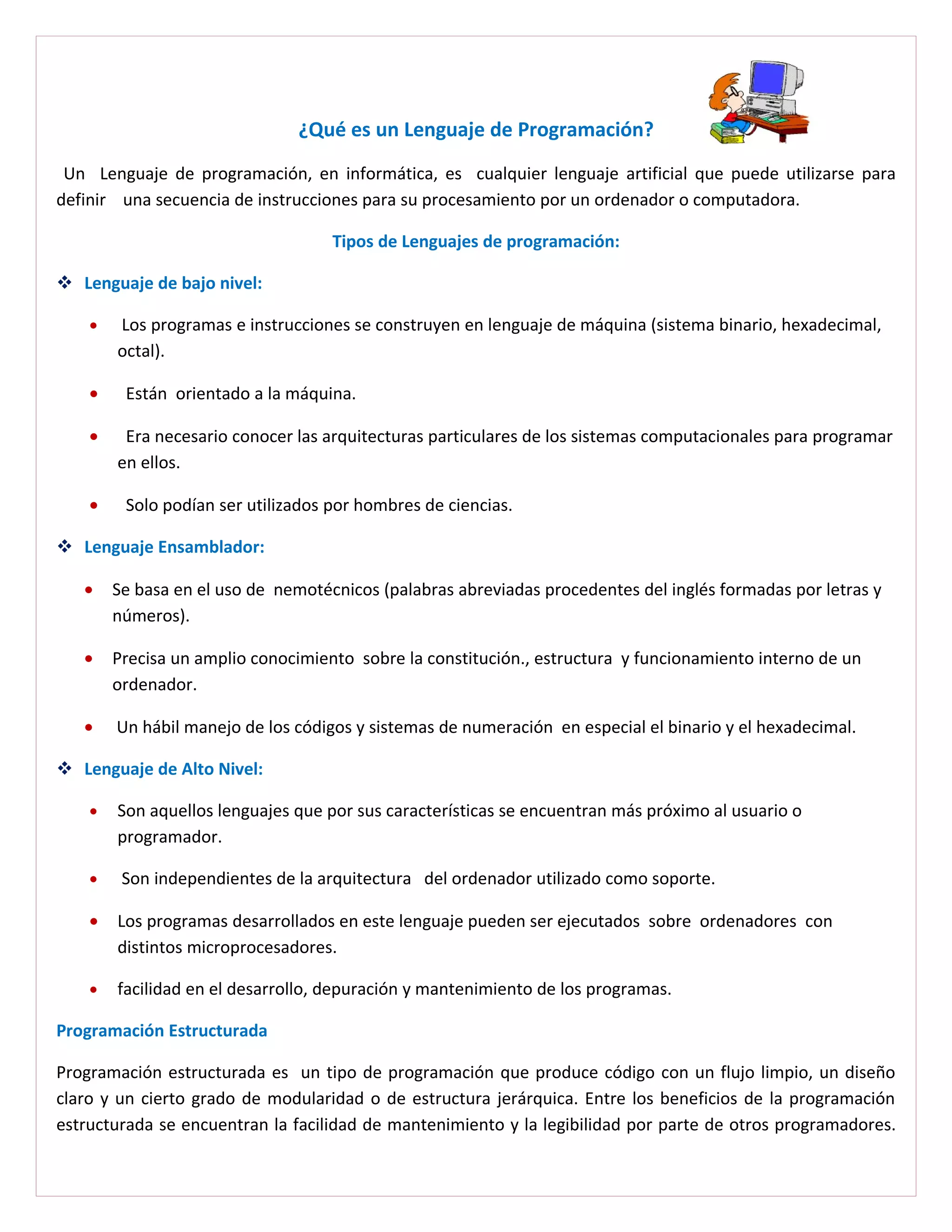 El documento describe los diferentes tipos de lenguajes de programación, incluyendo lenguajes de bajo nivel como el lenguaje de máquina y ensamblador, y lenguajes de alto nivel. También discute la programación estructurada, ensambladores, compiladores e intérpretes, estructuras de datos básicas, partes de un programa, algoritmos y diagramas de flujo.