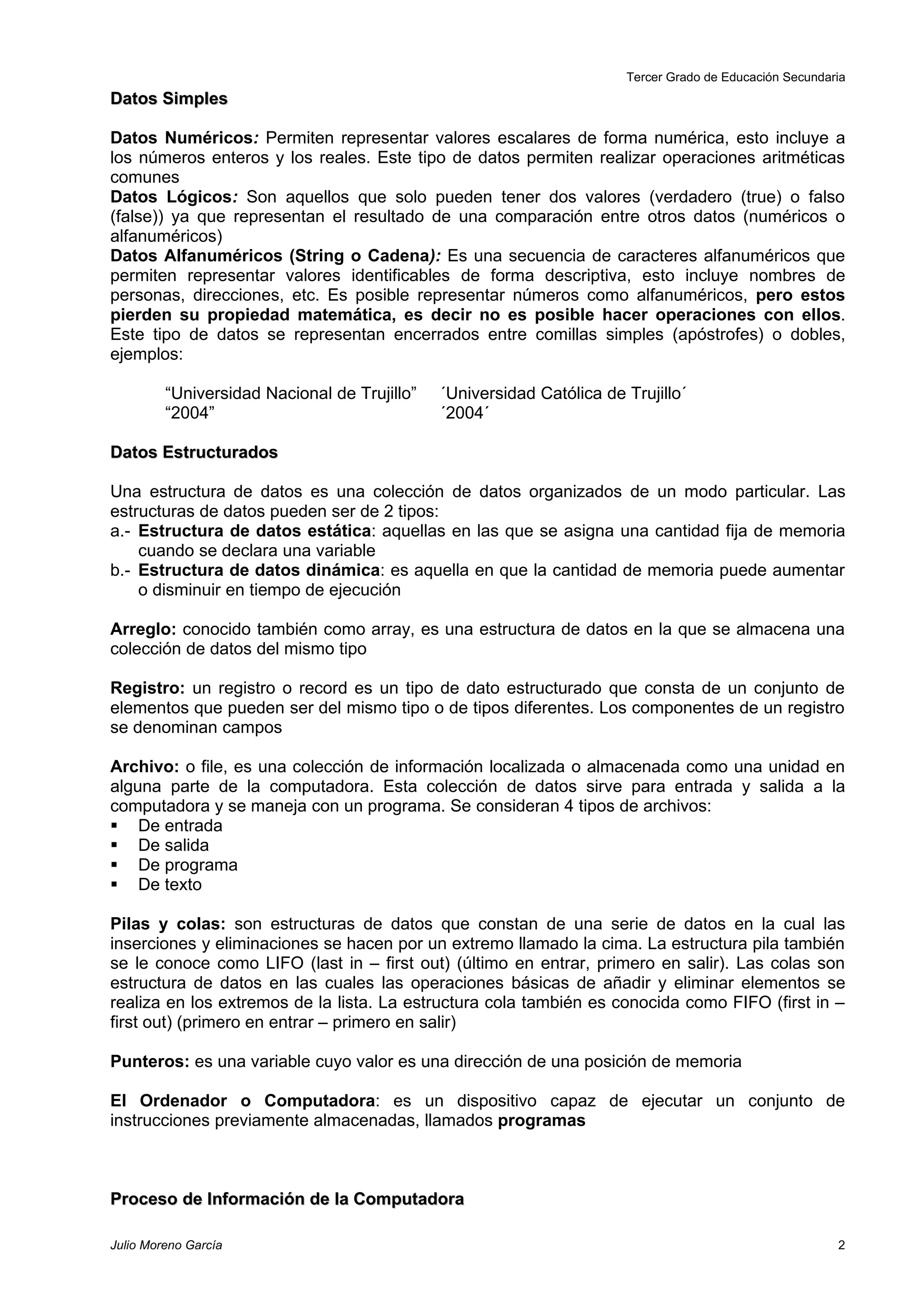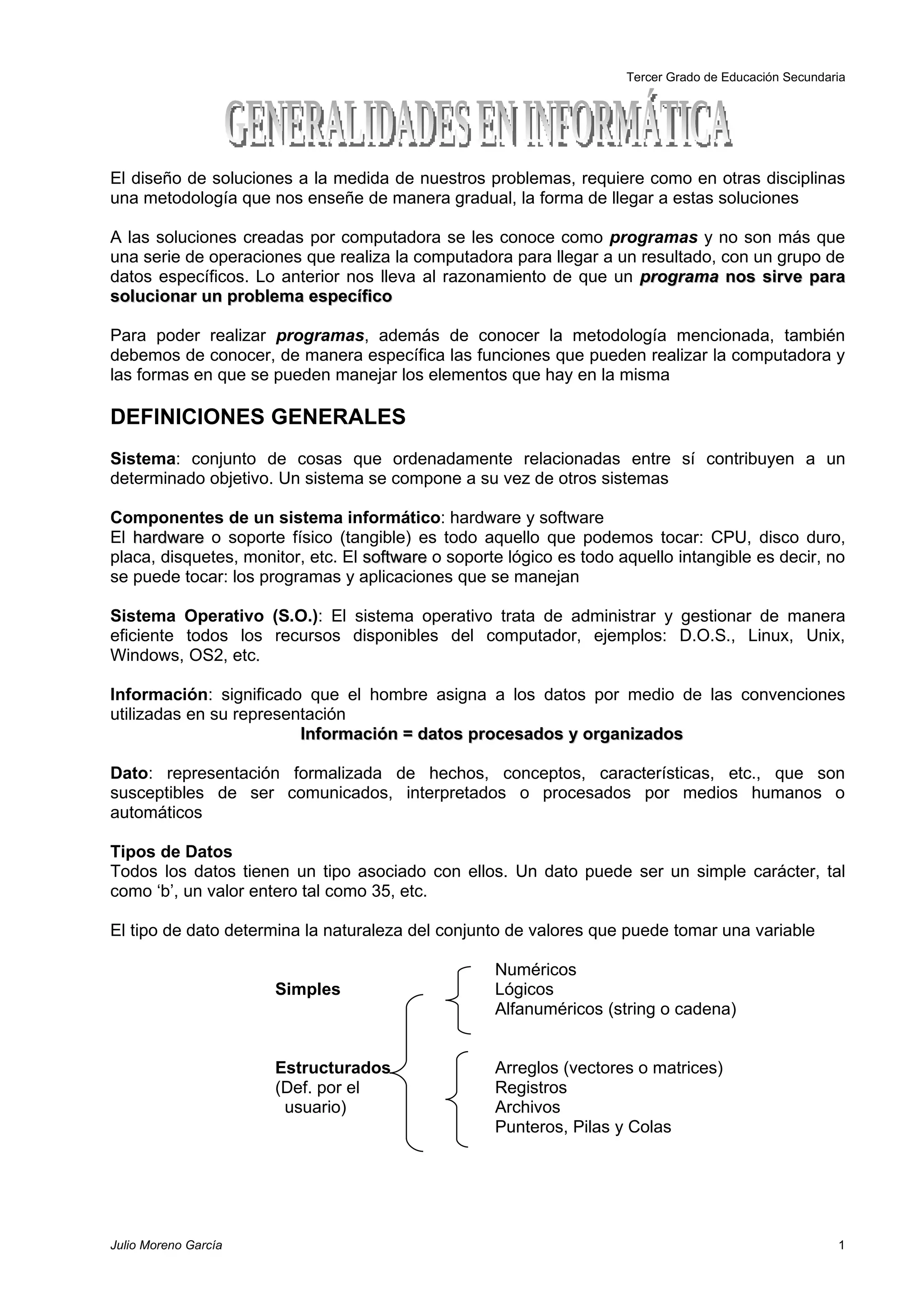 El documento describe conceptos básicos de programación y sistemas informáticos. Explica que un programa es una serie de operaciones que realiza la computadora para llegar a un resultado específico. También define tipos de datos, estructuras de datos como arreglos y registros, y conceptos como compiladores, intérpretes, lenguajes de programación, expresiones y operadores.