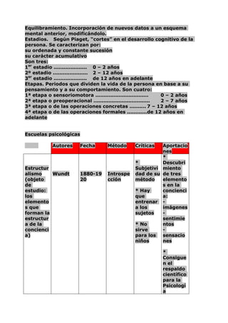 El documento presenta una introducción a la psicología, describiendo conceptos clave, términos utilizados por Piaget, la relación con otras ciencias, modelos de desarrollo, dimensiones de la conducta humana y métodos de investigación. Explica las escuelas psicológicas históricas como el estructuralismo, funcionalismo, conductismo, gestalt y psicoanálisis. También resume los conceptos del conductismo como el condicionamiento clásico e instrumental, y del psicoanálisis como el ello, yo y superyo