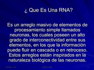 Este documento describe las redes neuronales artificiales, incluyendo su estructura, funcionamiento y mecanismos de aprendizaje. Explica que las RNA imitan a las redes neuronales biológicas mediante el uso de capas y que aprenden ajustando los pesos sinápticos a medida que procesan conjuntos de datos.