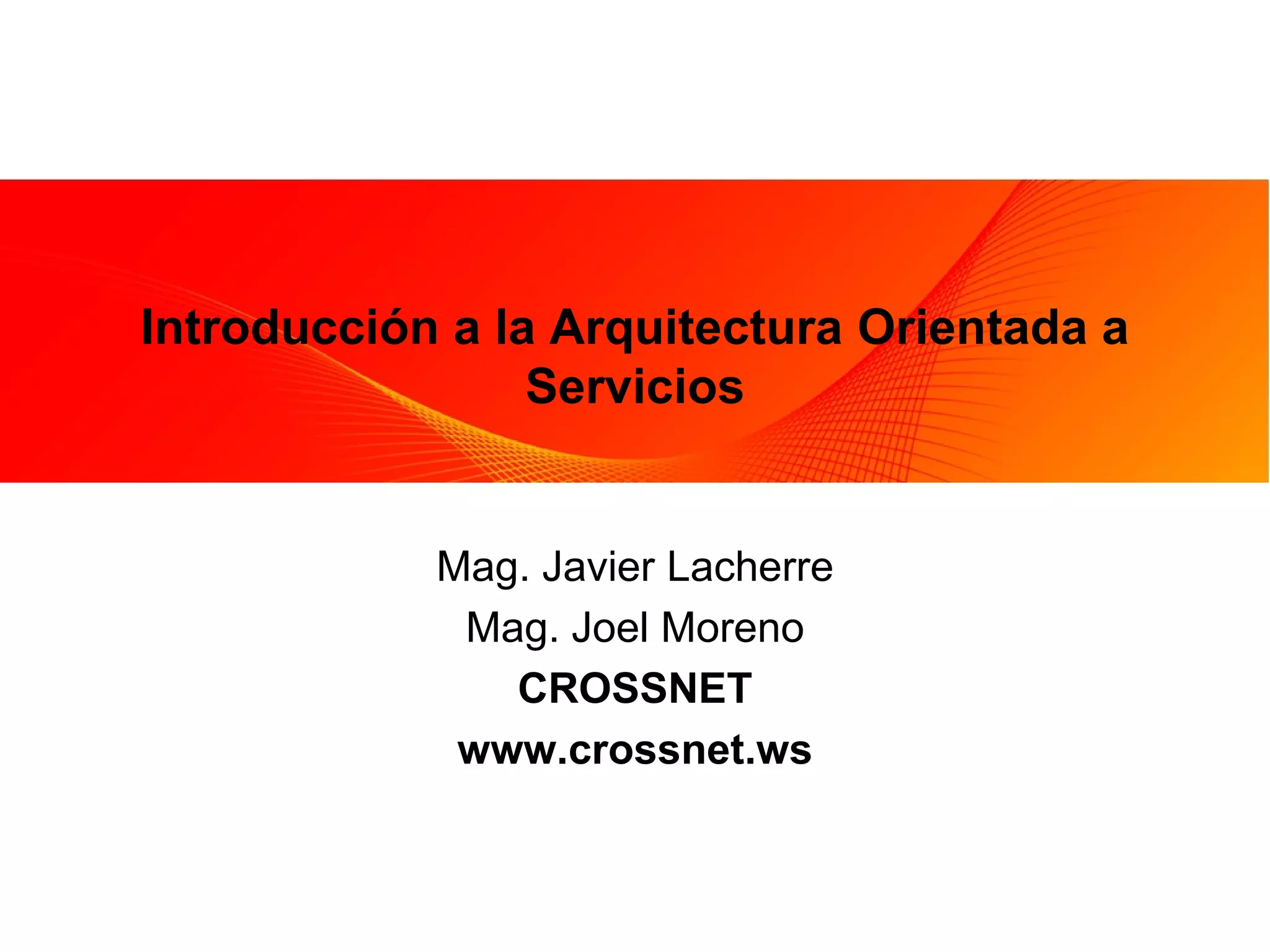 Este documento introduce los conceptos clave de la arquitectura orientada a servicios (SOA). Define SOA como un modelo arquitectónico que organiza las funciones de las aplicaciones empresariales en servicios interoperables basados en estándares que pueden combinarse y reutilizarse rápidamente. Explica que un servicio es una unidad de software reutilizable que expone sus funciones a través de estándares como WSDL. Finalmente, destaca que la aplicación de SOA conduce a mayor agilidad, flexibilidad y eficiencia para el negocio.