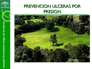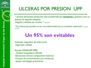 Este documento trata sobre la prevención de úlceras por presión en el Hospital Universitario Virgen de las Nieves. Las úlceras por presión son un problema frecuente que afecta a la calidad de vida de los pacientes y aumenta los costes del sistema sanitario. La enfermería juega un papel clave en la prevención a través de la valoración del riesgo, el cuidado de la piel y los cambios posturales. El documento describe factores de riesgo, escalas de valoración, diagnósticos, intervenciones de