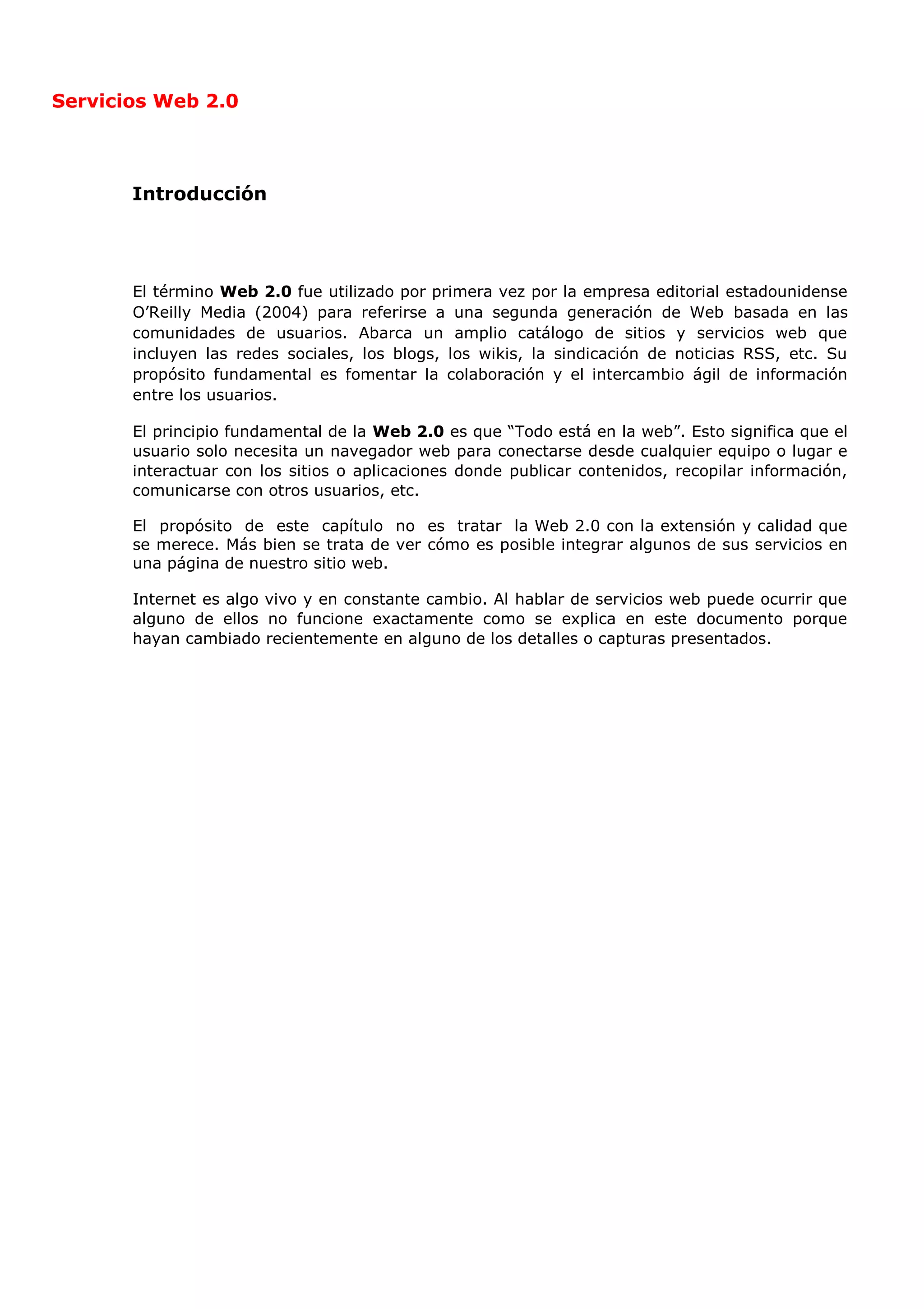 Este documento introduce la Web 2.0, que se refiere a una segunda generación de la Web basada en las comunidades de usuarios y que incluye redes sociales, blogs, wikis y RSS. La Web 2.0 fomenta la colaboración y el intercambio de información entre usuarios, y permite a los usuarios interactuar con sitios y aplicaciones desde cualquier dispositivo a través de un navegador web. El propósito del documento es mostrar cómo integrar servicios de la Web 2.0 en páginas web.