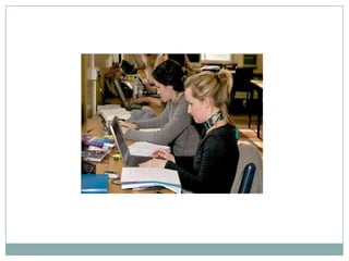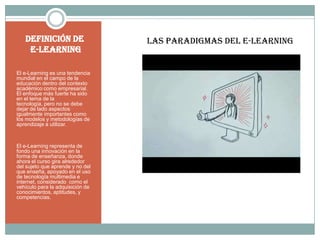 El documento introduce los fundamentos del e-learning, definiéndolo como una tendencia educativa apoyada en tecnología que permite a los estudiantes aprender a su propio ritmo. Explica que el e-learning centra el aprendizaje en el estudiante más que en el profesor y analiza sus características, tipos, ventajas y desventajas. Concluye que los profesores deben adaptarse a los nuevos métodos tecnológicos para mantener el interés de los estudiantes y mejorar la educación.