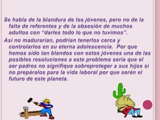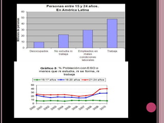 El documento describe la situación de los jóvenes que ni estudian ni trabajan (los llamados NINI) en México, estimados en 7 millones. Discute los desafíos que enfrentan para encontrar empleo debido a la falta de oportunidades y valores. También analiza algunos programas gubernamentales como el Programa del Primer Empleo y los factores como la precariedad laboral que influyen en su situación. Finalmente, enfatiza la importancia de promover el crecimiento económico para mejorar las perspectivas laborales de los jó