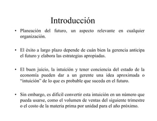 Este documento introduce los modelos de pronósticos y describe varios métodos para elaborar pronósticos. Explica que los pronósticos son estimaciones cuantitativas o cualitativas de eventos futuros basadas en información pasada o actual. Luego describe métodos cuantitativos como series de tiempo y regresión, y métodos cualitativos como juicio de expertos. Finalmente, detalla específicamente métodos de suavización como promedios móviles para pronosticar series de tiempo estables.