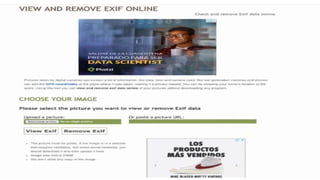 El documento instruye al lector a descargar una imagen de un perro en una cama de la página web Pexels, y luego procesar la imagen en los sitios web TinyPNG y VerExif para reducir su tamaño y eliminar los metadatos EXIF respectivamente.