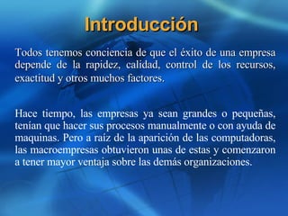 Este documento presenta una introducción a la computación y la programación. Explica que una computadora es un dispositivo electrónico capaz de realizar múltiples tareas mediante software y hardware. Describe los componentes básicos de un sistema informático y el proceso de entrada, procesamiento y salida de información. Además, distingue entre lenguajes de programación de bajo y alto nivel, e introduce conceptos básicos de programación orientada a objetos como objetos, propiedades, métodos y eventos.