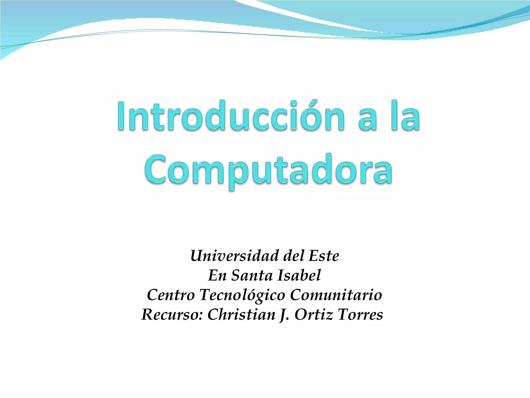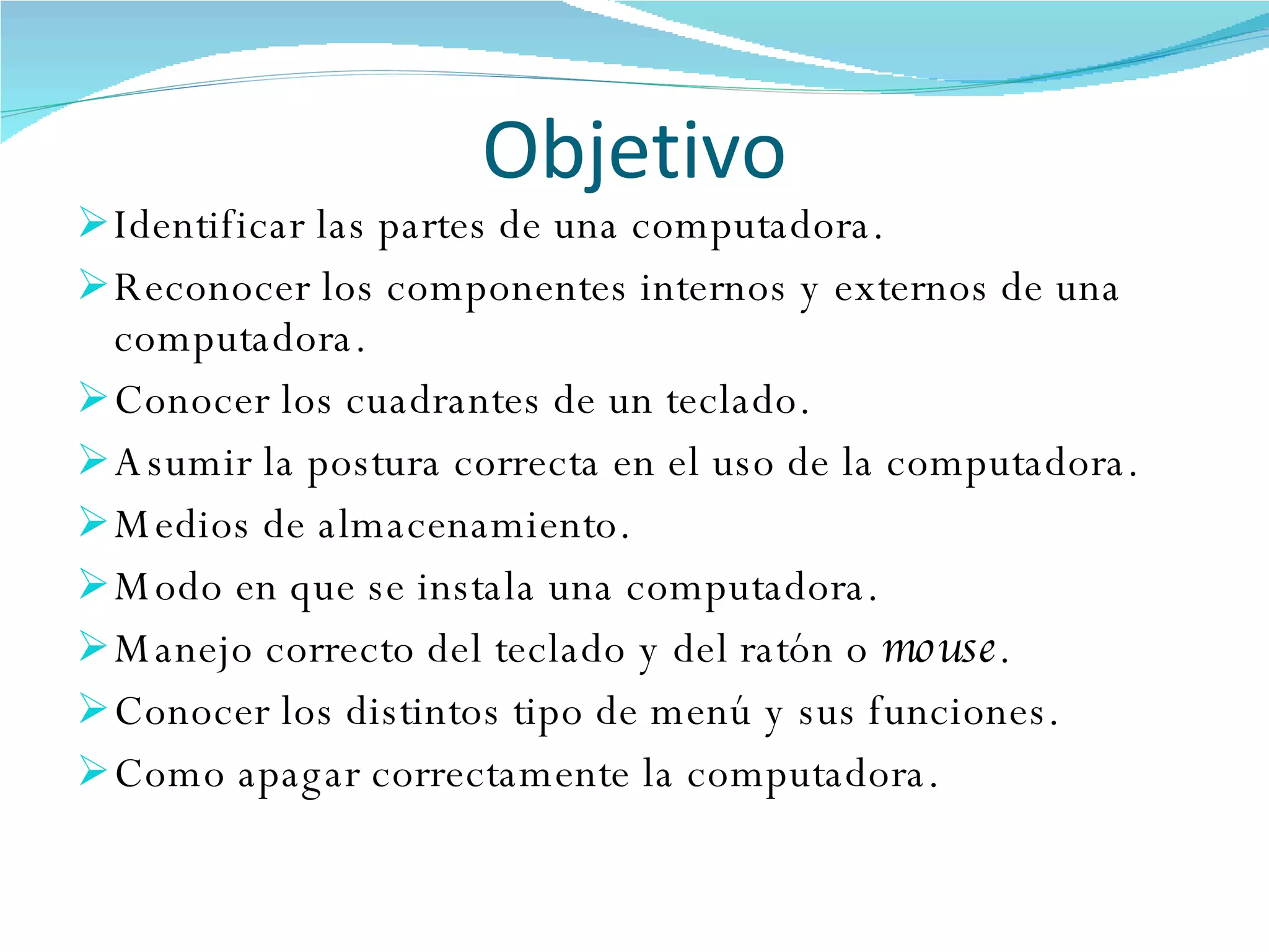 El documento describe las partes principales de una computadora, incluyendo el CPU, monitor, teclado, ratón, bocinas e impresora. Explica cómo identificar los componentes internos y externos de una computadora, y cómo usar correctamente el teclado, ratón, menús y medios de almacenamiento como USBs y CDs. También proporciona instrucciones sobre cómo sentarse correctamente, encender y apagar una computadora de manera segura.