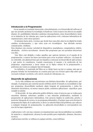 Este documento describe los conceptos básicos de la programación y el desarrollo de software. Explica que el desarrollo de aplicaciones implica varias etapas como el análisis del problema, el diseño de la solución, y la traducción del diseño a un lenguaje de programación. También define conceptos clave como algoritmos, lenguajes de programación, interfaz de usuario, y prototipado.