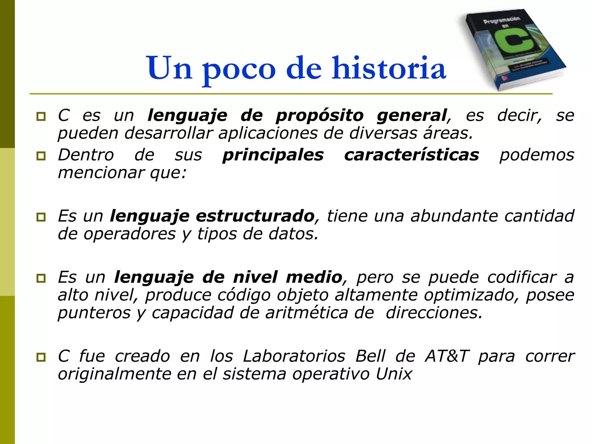 El documento describe el lenguaje de programación C. C es un lenguaje estructurado y de propósito general creado en los Laboratorios Bell para correr en el sistema operativo Unix. Entre sus ventajas se encuentra su portabilidad, eficiencia y claridad, mientras que entre sus desventajas están la falta de detección de errores en tiempo de compilación y la dependencia de bibliotecas para E/S. El documento también explica la forma de escribir programas en C, incluyendo la estructura básica de un programa, identificadores, coment
