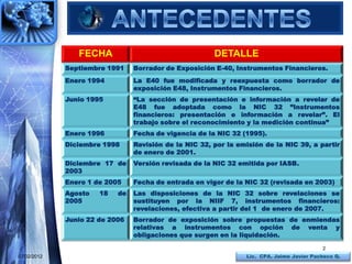 El documento detalla la evolución normativa de los instrumentos financieros, comenzando desde la NIC 32 hasta las enmiendas y la implementación de NIIF 7. Se aborda el reconocimiento, medición y presentación de activos y pasivos financieros en función de su naturaleza y los requisitos contables asociados. Además, se establecen principios para clasificar e informar sobre instrumentos financieros, mencionando exclusiones relevantes y definiciones clave en el contexto de contratos y derivados.