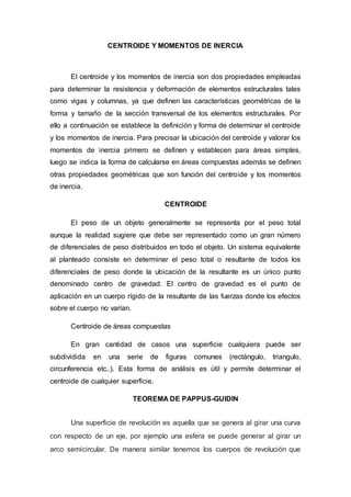 El documento define el centroide y los momentos de inercia, y explica cómo se usan para determinar la resistencia y deformación de elementos estructurales. Explica que el centroide es el punto donde se ubica la resultante del peso de un objeto, y que el momento de inercia depende de la distancia del área a un eje dado. También cubre cómo calcular el centroide y los momentos de inercia para áreas simples y compuestas, y define otras propiedades geométricas relacionadas.