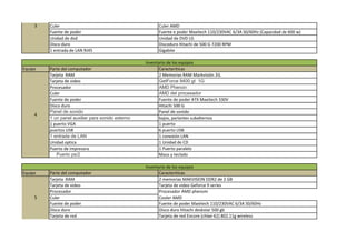 El documento presenta un inventario de 10 equipos de computadora que incluye las partes y características de cada uno. La mayoría de los equipos tienen tarjetas RAM Markvision de 2GB, procesadores AMD Phenom, discos duros Hitachi de 500GB, y fuentes de poder Maxitech.