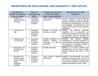 Este documento describe las diferentes actividades, tipos de evaluación y momentos del proceso educativo en que se aplican evaluaciones para un grupo de primer grado. La autora aplica evaluaciones diagnósticas, formativas y sumativas para identificar el nivel de dominio de lectoescritura de los estudiantes, reconocer problemas de aprendizaje y mejorar las estrategias de enseñanza.