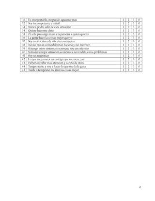 Este documento presenta dos inventarios para evaluar pensamientos automáticos y síntomas depresivos. El primer inventario lista 45 pensamientos automáticos comunes y pide al sujeto calificar la frecuencia con que los experimenta. El segundo inventario, la Escala de Beck, contiene 21 grupos de afirmaciones sobre sentimientos y comportamientos relacionados con la depresión, solicitando al sujeto seleccionar la opción que mejor lo describa. Al final se proveen instrucciones para calcular la puntuación total en la Escala de Beck y clasificar la gravedad