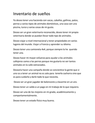 Este documento presenta los sueños e inventario de sueños de un estudiante de octavo grado. Entre sus sueños se encuentran ser veterinario, viajar internacionalmente, tener una camioneta 4x4, ayudar a los animales callejeros, ser jugador de baloncesto, y tener éxito académico. El estudiante analiza cuáles de estos sueños podría alcanzar en los próximos años y cuáles obstáculos podrían impedir que los logre.