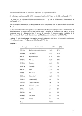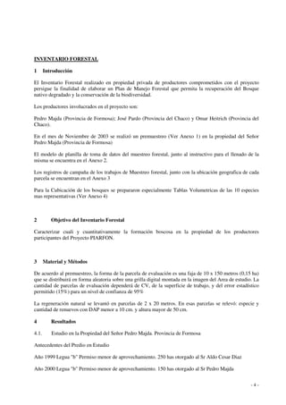 Este documento presenta los resultados de un inventario forestal realizado en las propiedades de tres productores en las provincias de Formosa y Chaco, Argentina. En la propiedad de Pedro Majda en Formosa, se identificaron 14 especies y se midió un área basal de 13,13 m2/ha. Las especies más comunes fueron quebracho colorado chaqueño, palo blanco y algarrobo negro. En la propiedad de José Pardo en Chaco, se identificaron 16 especies y se midió un área basal de 18,94 m2/ha. Las especies más com