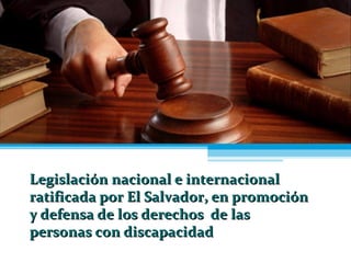 El documento detalla la legislación nacional e internacional ratificada por El Salvador en promoción y defensa de los derechos de las personas con discapacidad. Se mencionan leyes relevantes como la Ley de Equiparación de Oportunidades y tratados como la Convención sobre los Derechos de las Personas con Discapacidad de la ONU. Además, se señala la existencia de políticas nacionales dirigidas hacia la niñez, adolescencia y educación inclusiva.