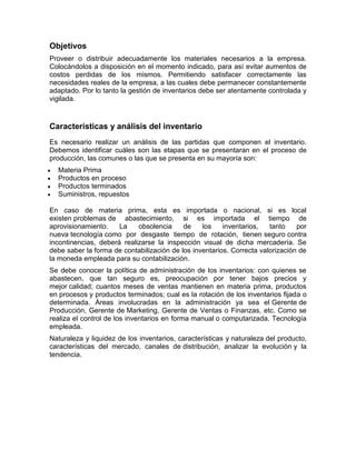 El inventario es el conjunto de mercancías o artículos que tiene la empresa para comerciar o fabricar y vender. Los inventarios incluyen materias primas, productos en proceso, productos terminados y suministros. Un buen manejo de inventarios es importante para satisfacer las necesidades de la empresa y evitar aumentos de costos o pérdidas.