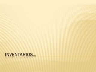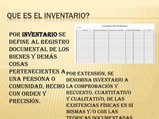 El documento define el inventario como el registro documental de los bienes pertenecientes a una persona o comunidad. Explica que un inventario de un centro de computo incluye elementos como monitores, CPUs, muebles, mouses, teclados y sillas. Además, clasifica los centros de computo por su actividad, tamaño y origen financiero e identifica el hardware y software como los principales componentes de un sistema de computo.