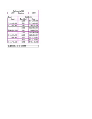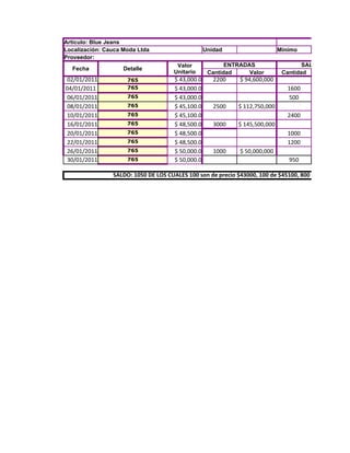 Este documento registra las entradas y salidas de inventario de pijamas para niñas y jeans azules en una tienda durante enero de 2011. Incluye detalles como fechas, referencias de productos, precios unitarios, cantidades y valores. El resumen muestra que hubo varias compras y ventas de ambos productos durante el mes, y al final quedaron saldos en inventario de 152 pijamas y 1050 jeans.