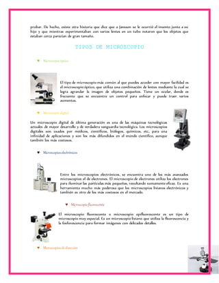 El documento describe la historia del microscopio y sus inventores. Explica que aunque Galileo Galilei teorizó sobre un dispositivo similar al microscopio en 1610, el inventor del primer microscopio compuesto fue probablemente el fabricante holandés de lentes Zacharias Janssen en 1590. También enumera y describe brevemente varios tipos de microscopios, incluyendo microscopios ópticos, digitales, electrónicos, fluorescentes y de disección.