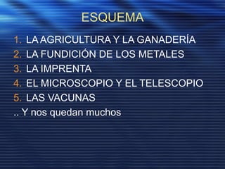 Este documento describe varios de los inventos más importantes de la humanidad como la agricultura y la ganadería, la fundición de metales, la imprenta, el microscopio y el telescopio, y las vacunas. Explica brevemente cómo cada uno surgió y cómo han beneficiado a la sociedad, permitiendo avances en la alimentación, la fabricación de herramientas y armas más resistentes, la difusión del conocimiento, el descubrimiento del mundo microscópico y cósmico, y la prevención de enfermedades, respectivamente.